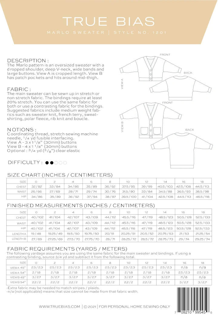 The main sweater can be sewn up in stretch or nonstretch fabric. The bindings require at least 20% stretch. You can use the same fabric for both or use a contrasting fabric for the bindings. Suggested fabrics include medium weight fabrics such as sweater knit, french terry, sweatshirting, polar fleece, rib knit and boucle. -